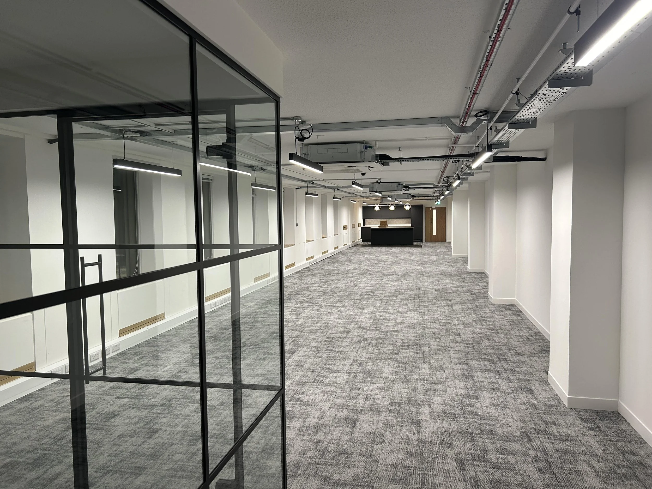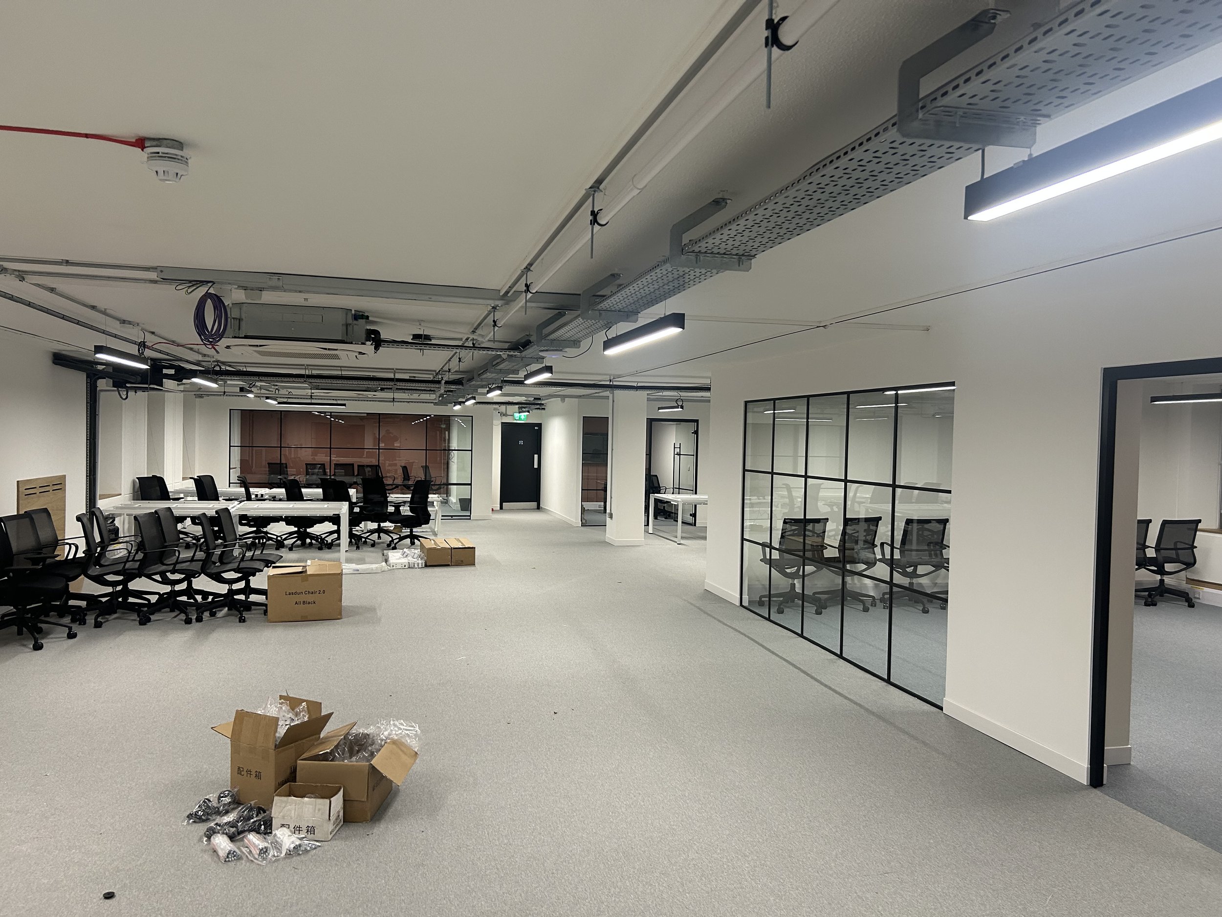 A fully certified commercial office installation with an industrial exposed finish, completed to allow the client to take occupation.